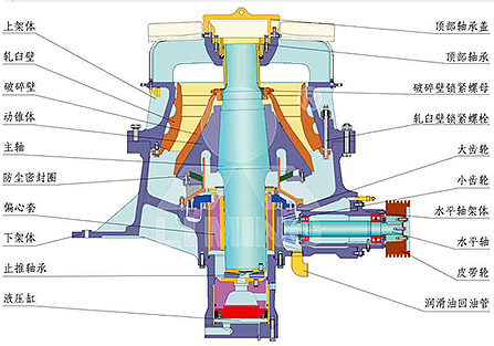 HST單缸液壓圓錐破碎機主要由上架體、中架體(中碎型)、下架體、動錐部、偏心套部、傳動部、液壓缸部等部件組成。