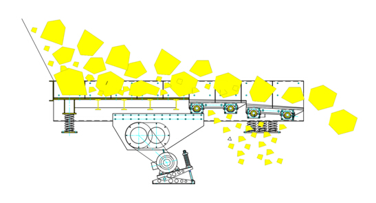 TSW給料機慣性式雙偏心軸激振器能產(chǎn)生定向激振力。兩軸之間有一對傳動比為1的齒輪副連接,保障其回轉(zhuǎn)方向相反,轉(zhuǎn)速相等。通過電動機驅(qū)動,兩偏心軸旋轉(zhuǎn),由于兩軸上的偏心質(zhì)量和偏心距大小相等,所產(chǎn)生的慣性力在一個方向互相抵消,而在另一個方向互相疊加,從而合成的定向激振力,使與此激振器剛性連接的給料槽體在支承彈簧上做強制振動,物料在振動力的作用下,在料槽上作滑動及拋擲運動,從而使物料前移而達到給料目的。當物料通過槽體上的蓖條時,較小的物料通過蓖條之間的間隙落下,不再經(jīng)過破碎而直接進入下道破碎工序,從而起到預篩分效果,充分保障破碎設備的破碎效率及能力。